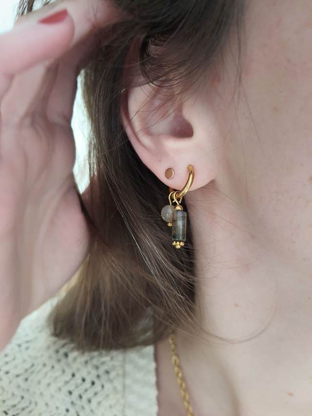 Des boucles d'oreilles qui invitent à briller. Ornés de labradorite et de pierre de lune, ces boucles faites à la main seront un parfait soutien au quotidien, discrètes mais puissantes.